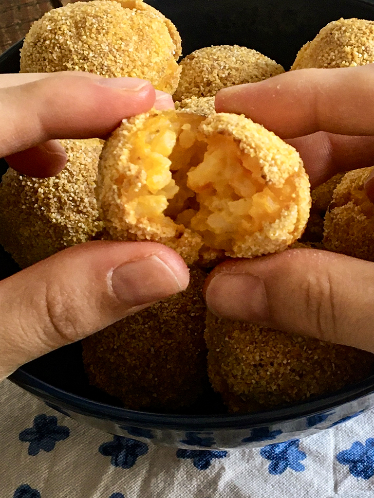 Formare delle palline con il riso della grandezza desiderata. Sbattere un uovo con un pizzico di sale, utilizzando una forchetta e preparare due piatti diversi contenti uno la farina di riso e l'altro quella di mais.