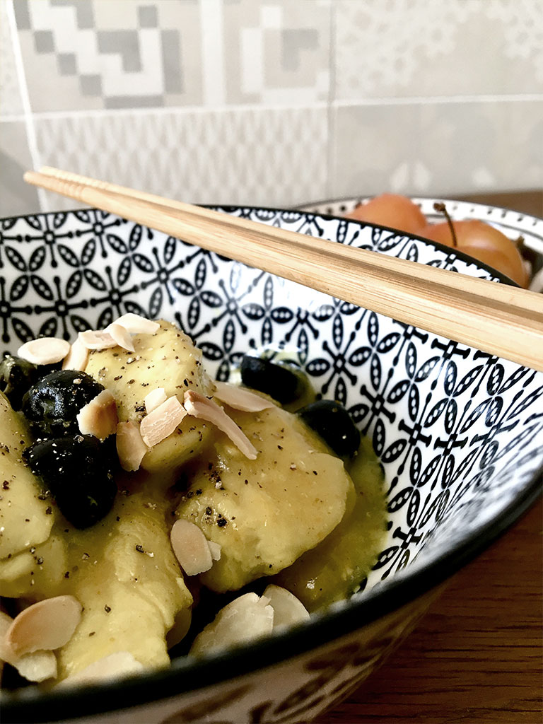 Intanto stemperare l'amido di mais nel latte di cocco ed aggiungerlo al pollo a metà cottura, insieme al curry. -