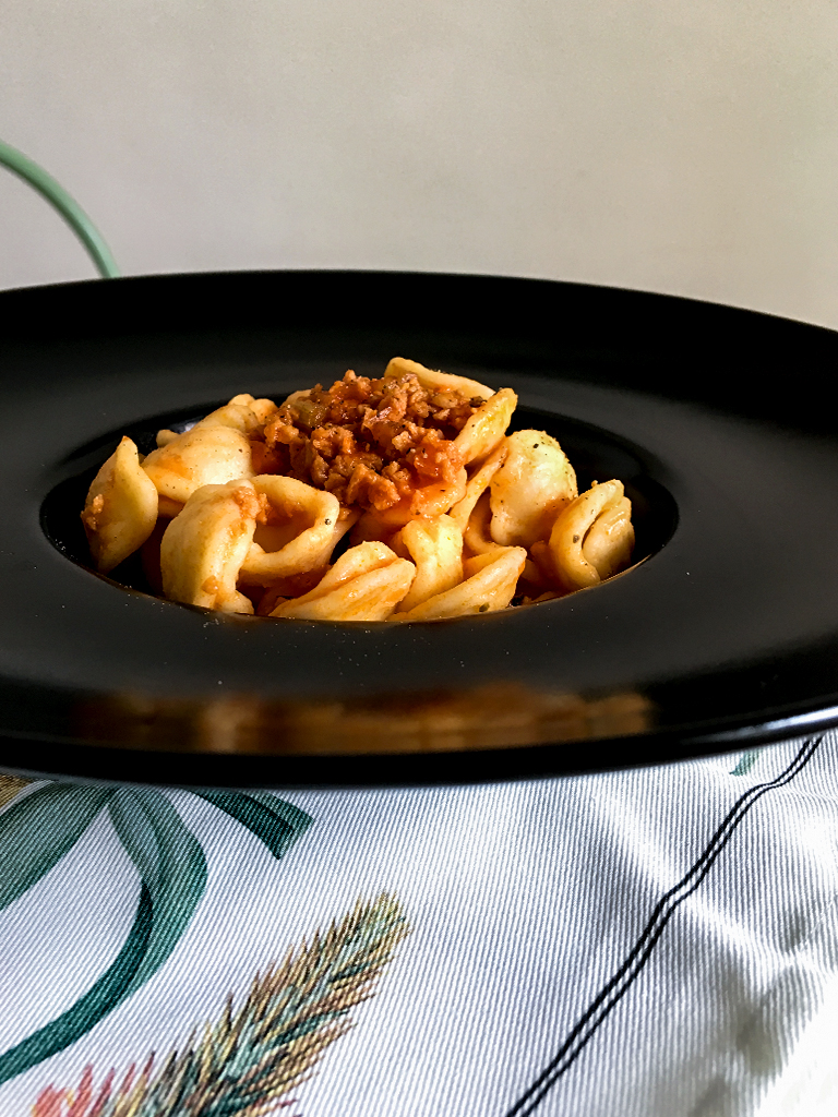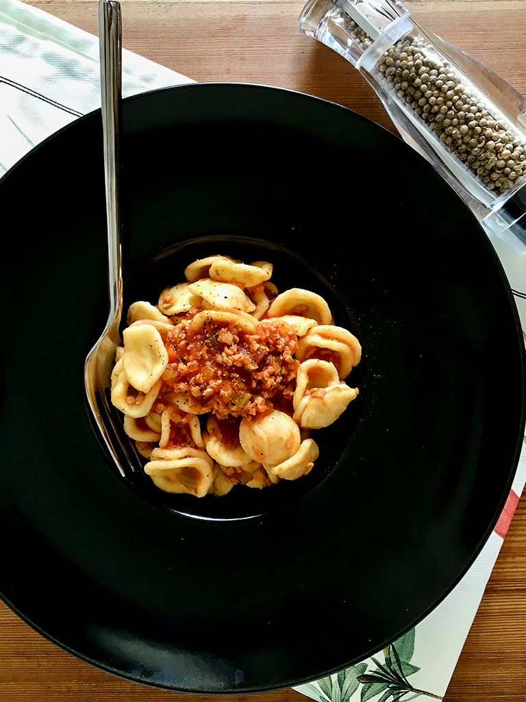 Mescolare la pasta con il ragù e servire completando con il pepe nero.