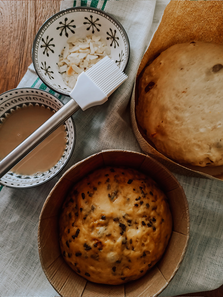Spennellare il composto sulla superficie del panettone e completare distribuendo le mandorle a filetti.