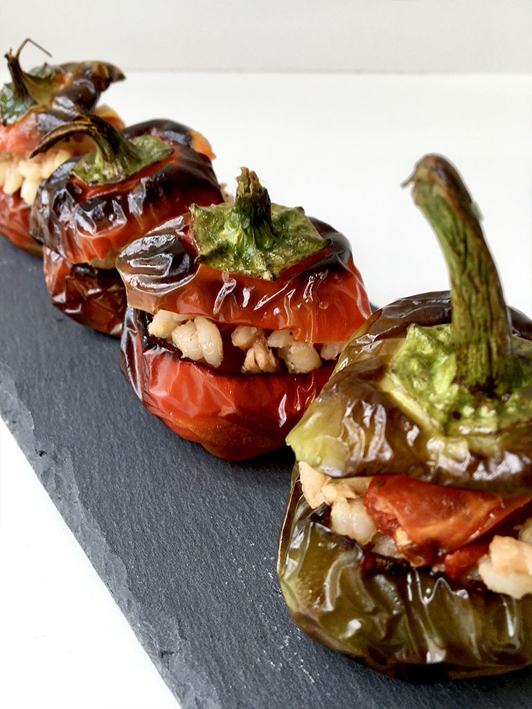 Peperoni ripieni di orzo, pomodori al forno e tonno