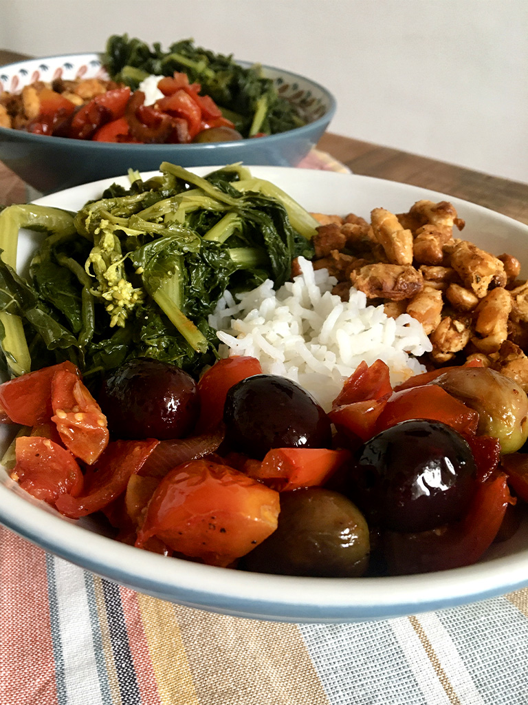Pokè bowl con rape, olive, pomodori e fagioli speziati