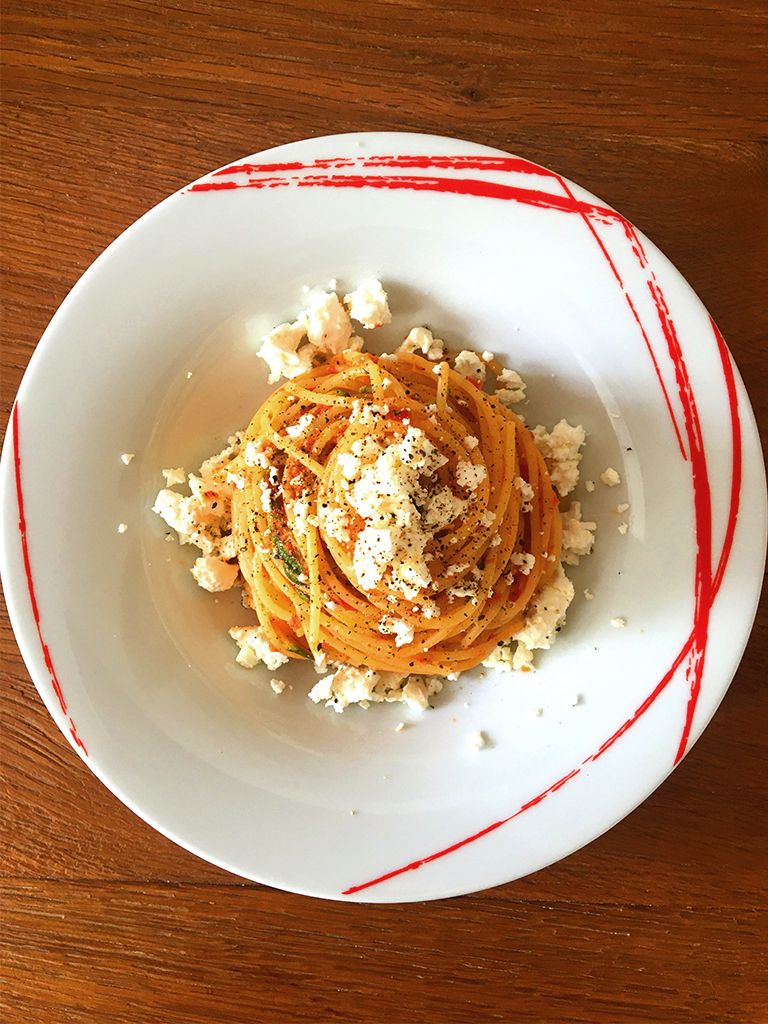 Completare sbriciolando la feta sugli spaghetti e concludere con un giro d’olio EVO a crudo ed una manciata di pepe nero.