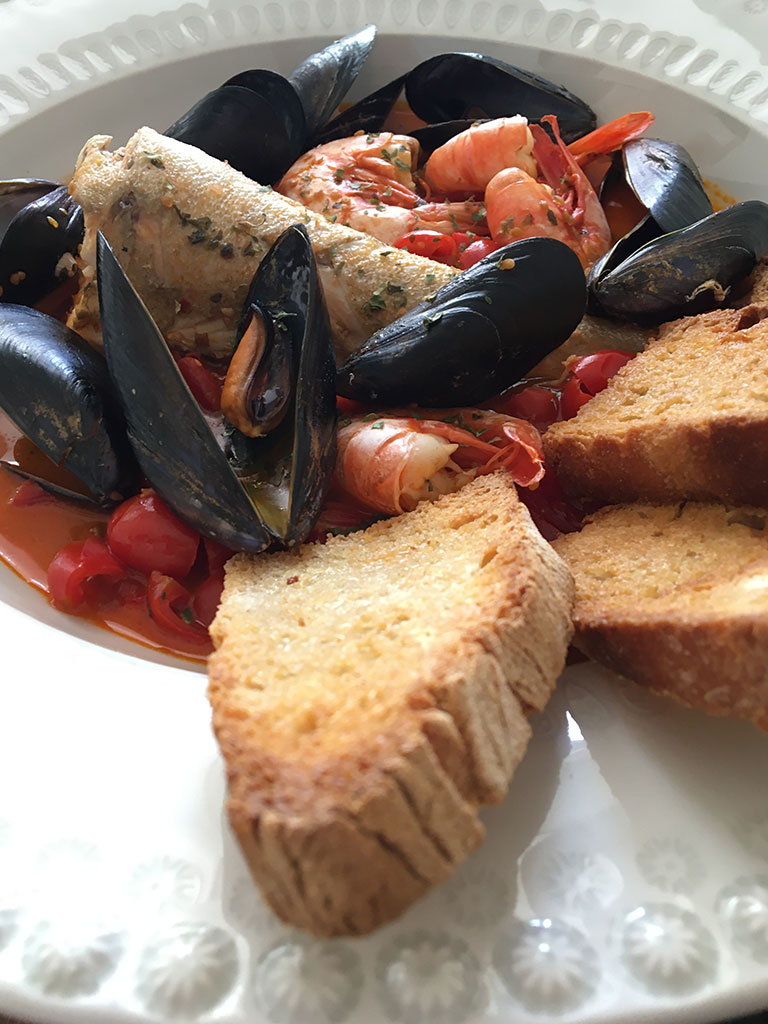 Adagiare l’aglio in una padella antiaderente calda con poco olio, aggiungere di seguito la gallinella, il pomodoro fresco, sale e pepe.