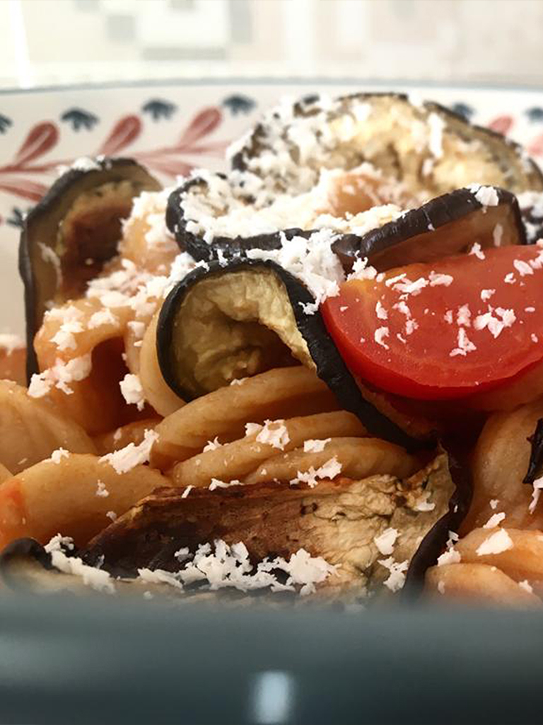 Cavatelli con crema di zucchine, datterini al forno e ricotta salata